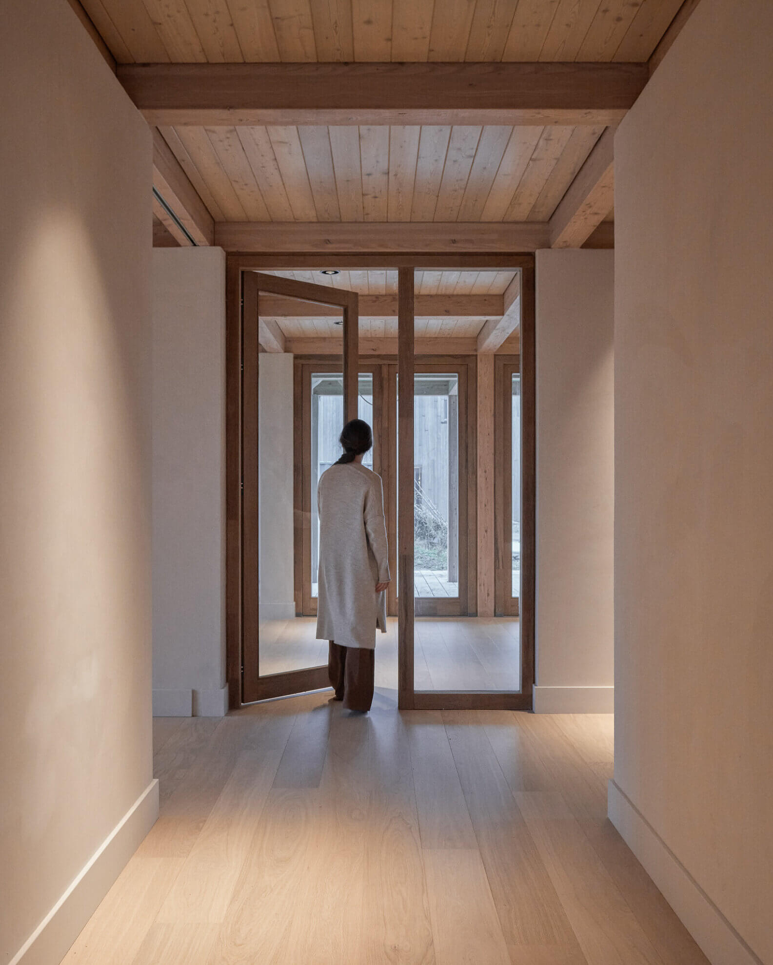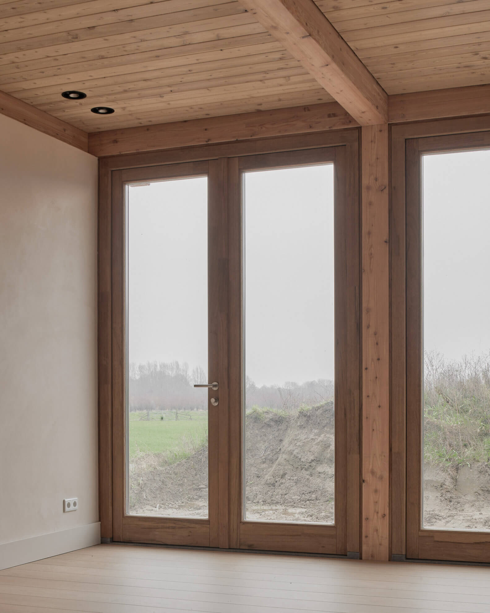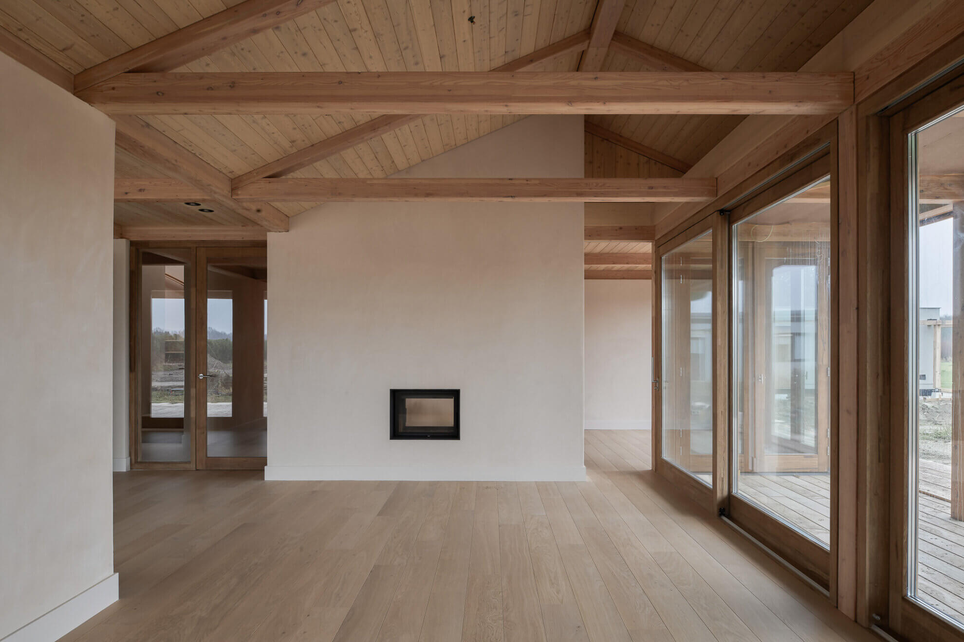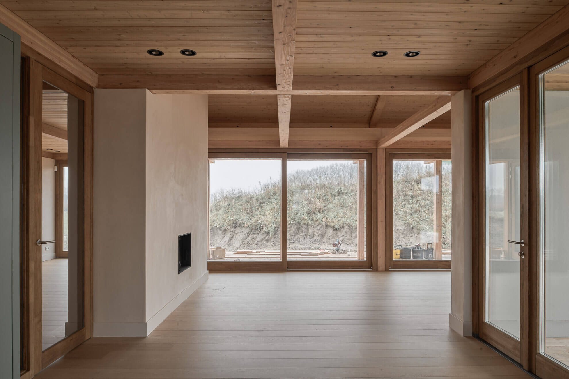 The construction is built from larch columns and beams. Due to the generous roof overhangs and the meandering façade line, several outdoor rooms are created around the house. These places form an extension of the home and make it possible to sit outside at any moment of the day and in every season. Thanks to the careful orientation towards the sun, a pleasant balance between sun and shade is created, both inside and outside.